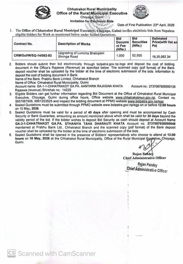 Invitation for Electronic Bid of Upgrading of Chandisthan Dandapokhari Maulipur Road Section