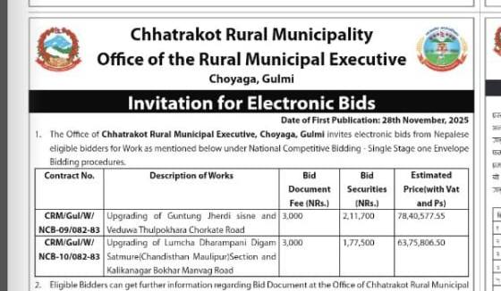 » Invitation for Electronic Bids. Date of first Publication:- 28 November, 2025 on Butwal today .