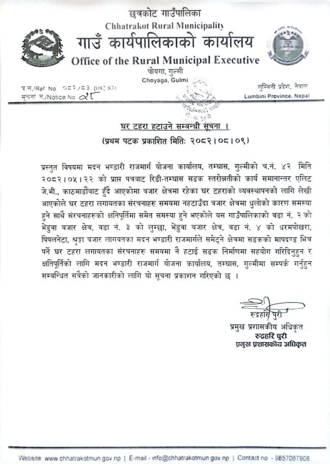 घर टहरा हटाउने सम्बन्धी सूचना।