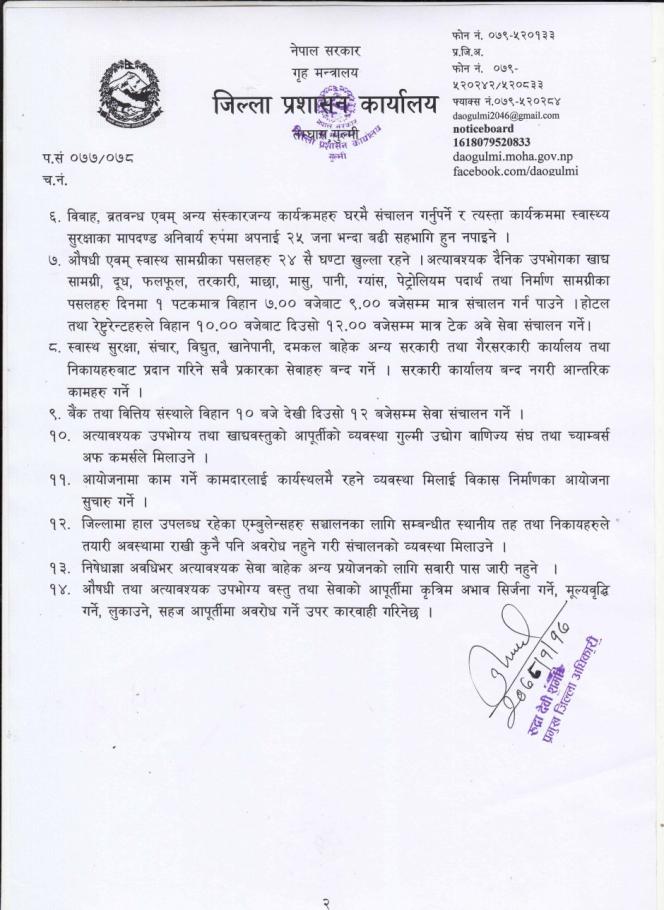 जिल्ला प्रशासन कार्यालय, गुल्मीद्वारा जारी गरिएको निषेधाज्ञा सम्बन्धि आदेश !!!