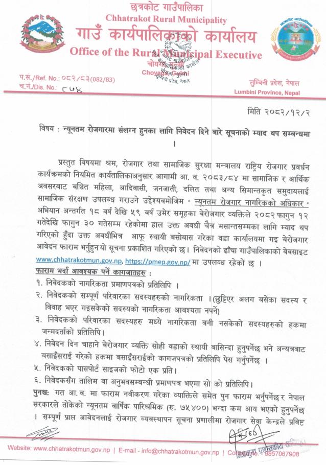 न्युनतम रोजगारमा सग्लंन हुनका लागि निवेदन दिने वारे सुचनाको म्याद थप सम्बन्धमा