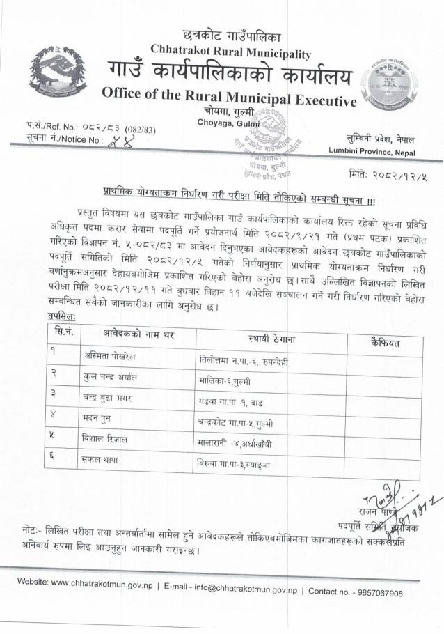 प्राथमिक योग्यताक्रम निर्धारण गरी परीक्षा मिती तोकिएको सम्बन्धी सूचना