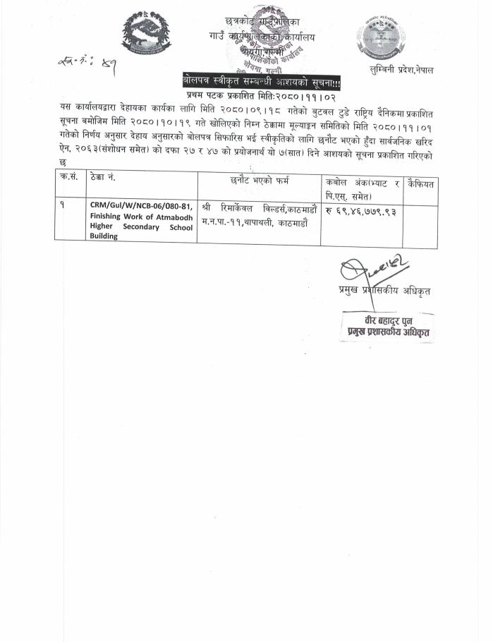 बोलपत्र स्वीकृत सम्बन्धी आशयको सूचना !!!