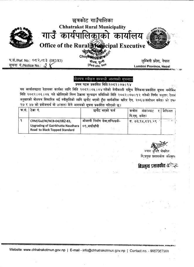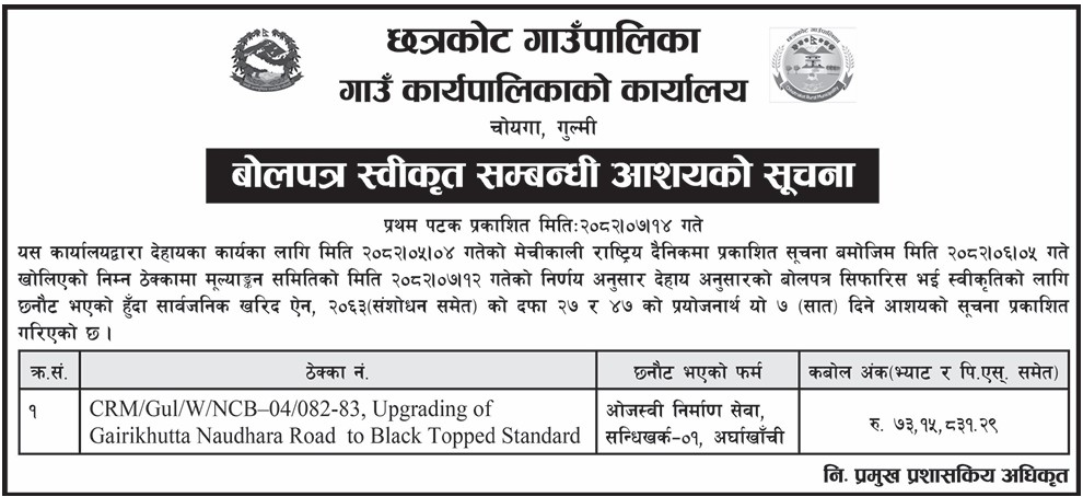 बोलपत्र स्वीकृत सम्बन्धी आशयको सूचना !!!
