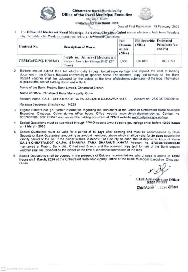 Invitation for Eldectronic Bids of Supply and Delivery of Medicine and Surgical Items for Shringa PHC (2nd Phase)